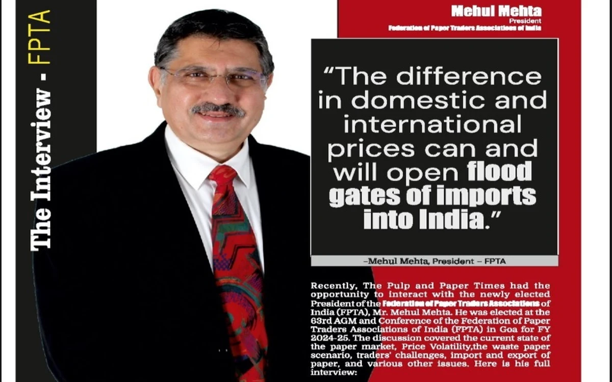 Recently, The Pulp and Paper Times had the opportunity to interact with the newly elected President of the Federation of Paper Traders Associations of India (FPTA), Mr. Mehul Mehta. He was elected at the 63rd AGM and Conference of the Federation of Paper Traders Associations of India (FPTA) in Goa for FY 2024-25. The discussion covered the current state of the paper market, Price Volatility, the waste paper scenario, traders' challenges, import and export of paper, and various other issues. Here is his full interview: