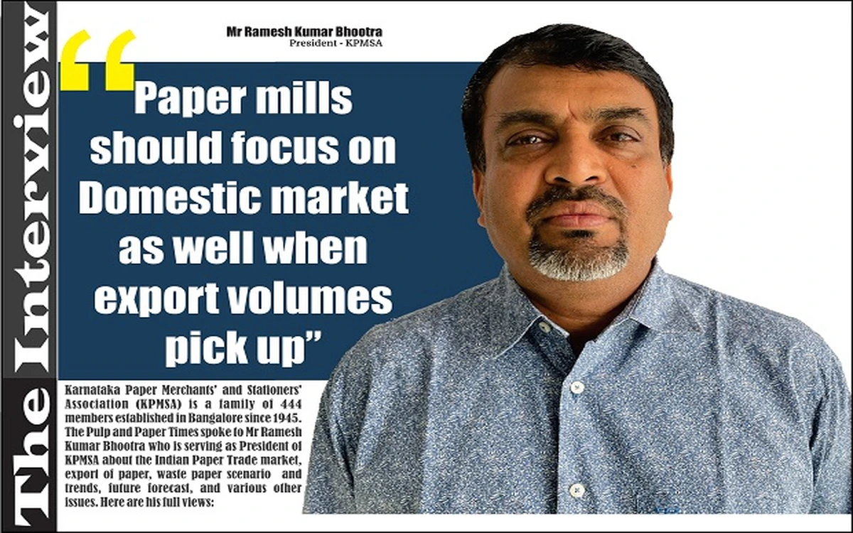Karnataka Paper Merchants' and Stationers' Association (KPMSA) is a family of 444 members established in Bangalore since 1945. The Pulp and Paper Times spoke to Mr Ramesh Kumar Bhootra who is serving as President of KPMSA about the Indian Paper Trade market, export of paper, waste paper scenario and trends, future forecast, and various other issues. Here are his full views: